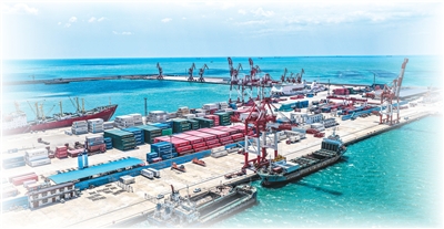 在山东省荣成市石岛新港口岸,满载跨境电商货物的外籍货轮在进行集装箱装卸作业。 李信君摄(人民视觉)